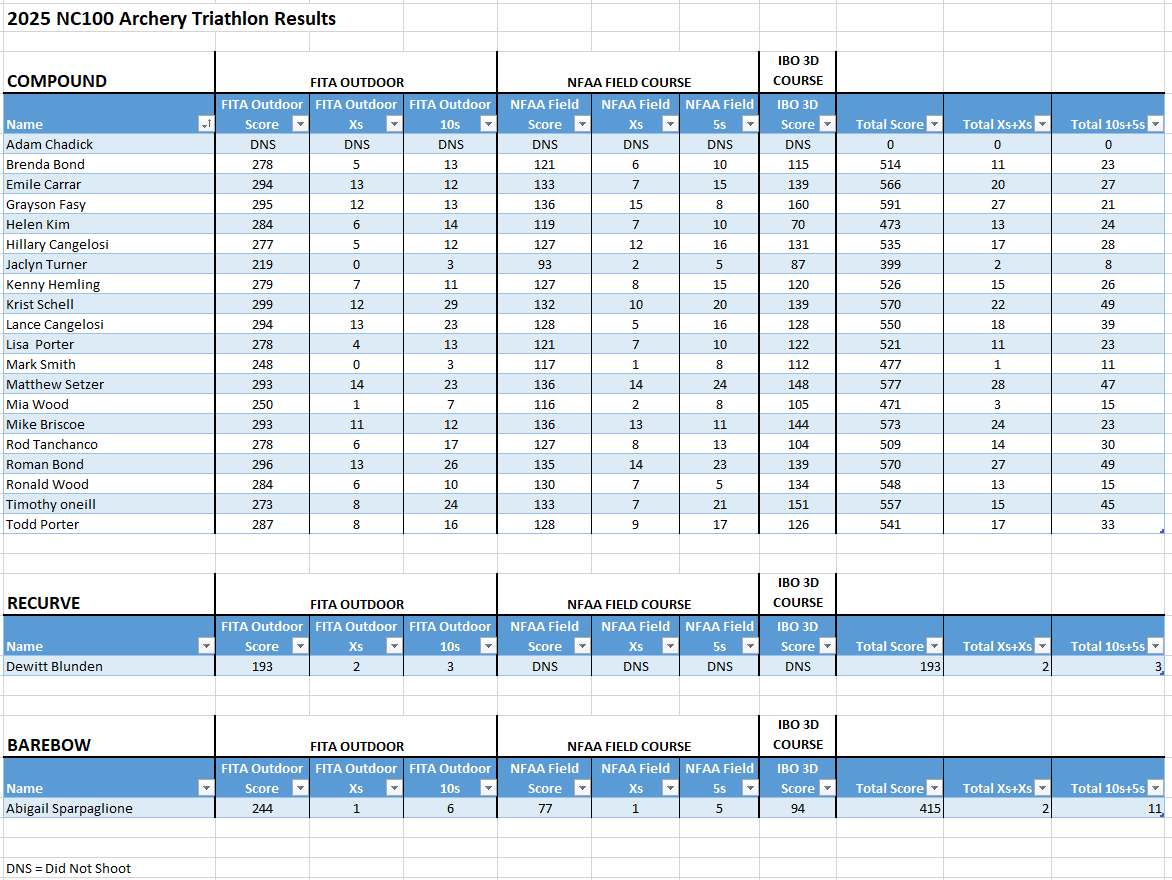 The 2025 NC100 Archery Triathlon is a wrap! Thank you to all of the archers who participated and the volunteers who made it possible! The winners and full scores are listed below (scores are sorted alphabetically).