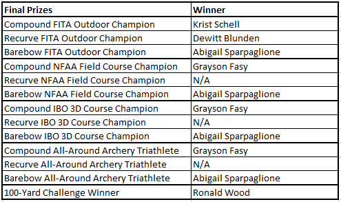 - Beginner’s Class archers will not be eligible for any prizes other than the Beginner’s Luck Prize, which will be a random drawing from the pool of Beginner's Class archers.